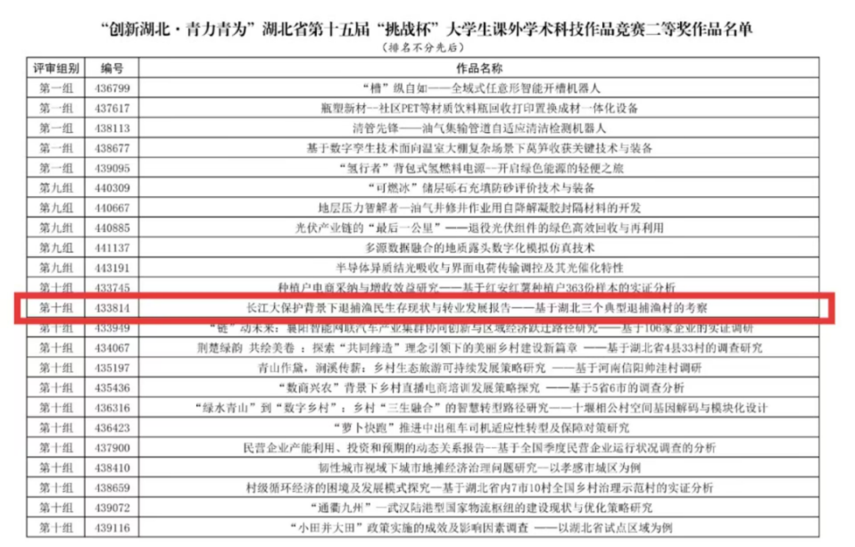 在刚刚结束的湖北省第十五届 “挑战杯” 大学生课外学术科技作品竞赛中,我院“长江禁捕生态护卫队”凭借扎实的调研、创新的思维和出色的表现,从众多参赛队伍中脱颖而出,荣获二等奖。