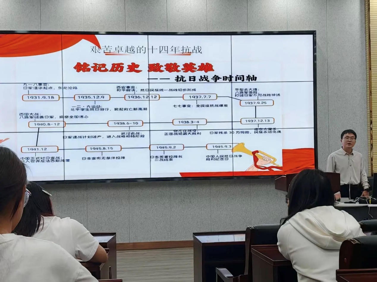 为加强学生骨干队伍建设,我院于近日举办专题培训。我院辅导员袁野老师在第一讲的课程中以“缅怀抗战英魂,践行和平使命”为主题为团校学员们讲授第一课。先回顾了抗战历史——从十四年抗战的时间线,到淞沪会战等六大战役,还有全民牺牲与中共的中流砥柱作用;接着讲了张自忠、杨靖宇等英烈事迹;再解读抗战精神的内核;最后点明纪念意义,还告诉我们青年该以责任担当践行和平使命。