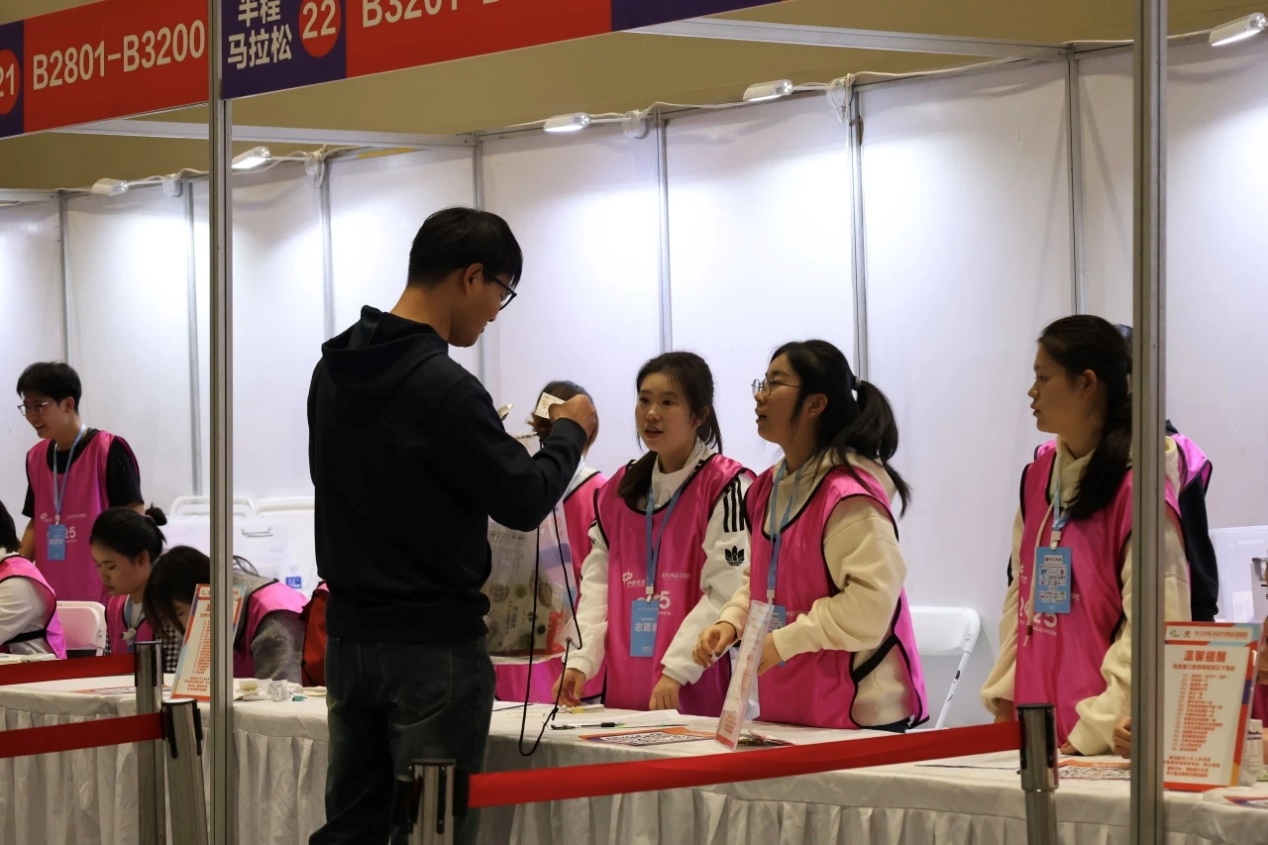 志愿者们在展馆内分发物资。面对络绎不绝的参赛选手与市民,志愿者们以严谨细致的态度开展签到引导、咨询解答、物资发放等工作。他们熟练掌握赛事流程,耐心为选手讲解参赛注意事项;认真核对信息;主动帮助有需要的人。从展馆入口到咨询台前,他们用真诚的态度,展现着我校学子的责任与担当。
