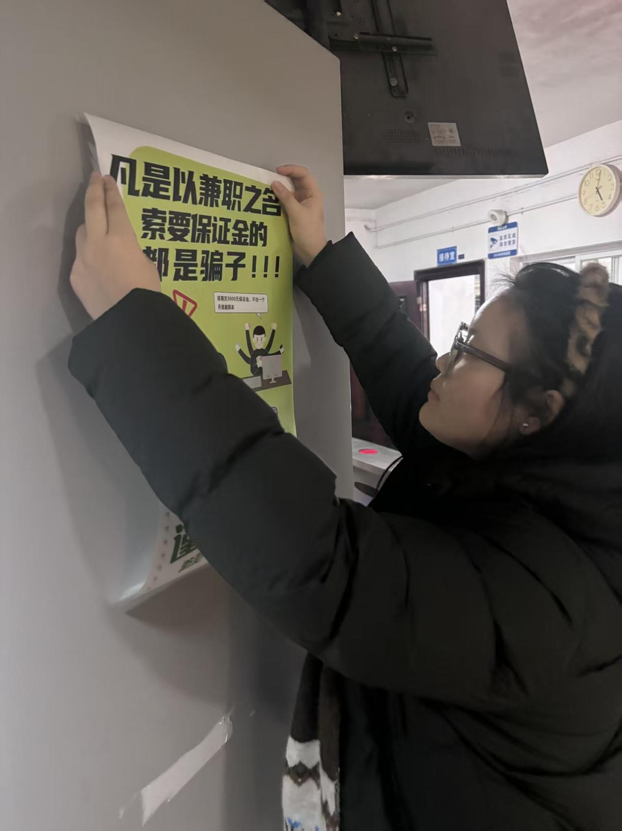 预备党员在女生宿舍五栋张贴防诈骗宣传海报,增强同学们的安全防范意识,筑牢校园反诈安全防线,切实守护大家的财产安全。